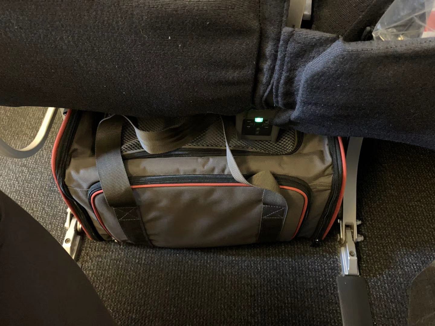 上飞机后跟空乘说一声,可能人家也见过很多次宠物登机了,提醒几句就没有再管我们。之前提到的笼子问题,非常幸运的是,petsfit 笼子刚刚好能放在座位下,这款 petsfit 的笼子还有一点非常好,它带有一个可以折叠起来的空间,飞机平稳飞行后,把折叠部分打开,耶加在里面可以稍微舒服一些,可是 13h 的飞行对于耶加来说,还是一段非常难受的旅程。飞行的后半段耶加一直在叫,嗓子都哑了,幸好飞机上噪音比较大,没有影响其他人。期间我们带到卫生间放他出来,活动一下,顺便喂点水。
