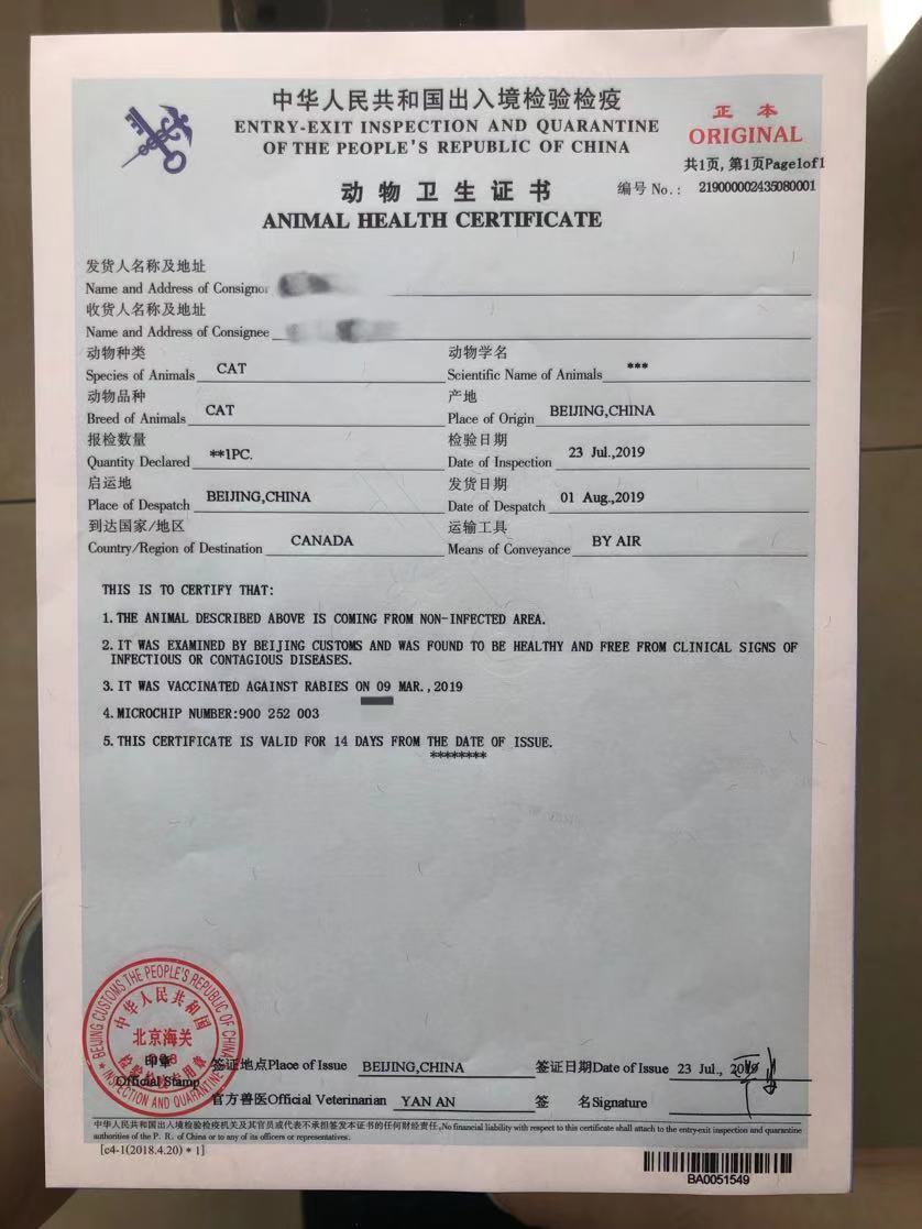 《动物卫生证书》一式三份,上面会用英文注明发货人姓名、品种、达到国家、经过检查确认健康、接种狂犬疫苗及日期、芯片号码等,因此只需要办理《动物卫生证书》即可满足中加两国要求,不需要额外的文件。另外自 18 年 6 月开始,中国全面取消《入出境货物通关单》,如果看到旧的攻略提到这个,不要担心,实际已经不需要了。