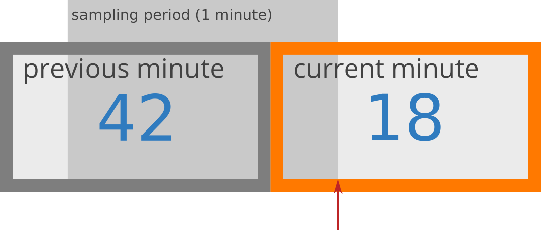 To give you an example, suppose the window period is 1 minute, the counter of the previous window is 42, and the current window starts 15 seconds ago. Based on this, the rate approximation of the current window can be calculated calculated like this: 42 * ((60 - 15) / 60) + 18 = 49.5